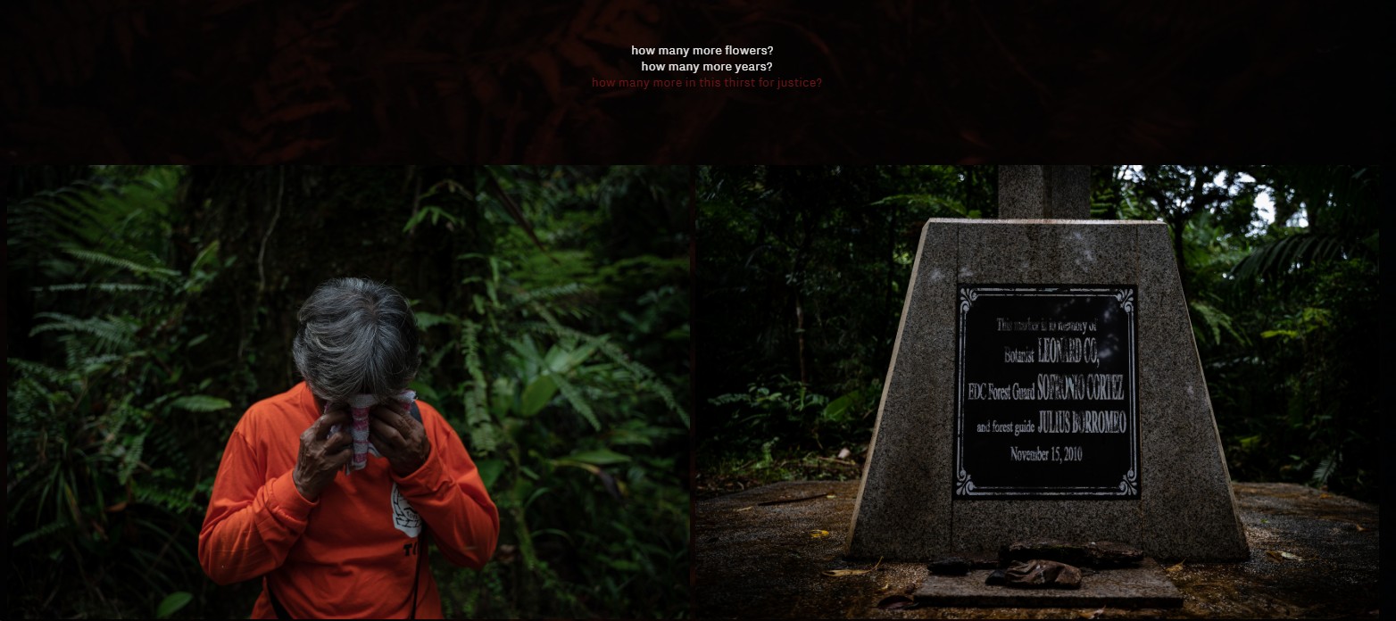 Teresita Borromeo, 56, the widow of slain forest guide Julius Borromeo, revisits the roots of where her husband was murdered in Kananga, Leyte. She works as a farmer to provide for her five bereaved children as a single mother in a decade’s worth in search for justice.