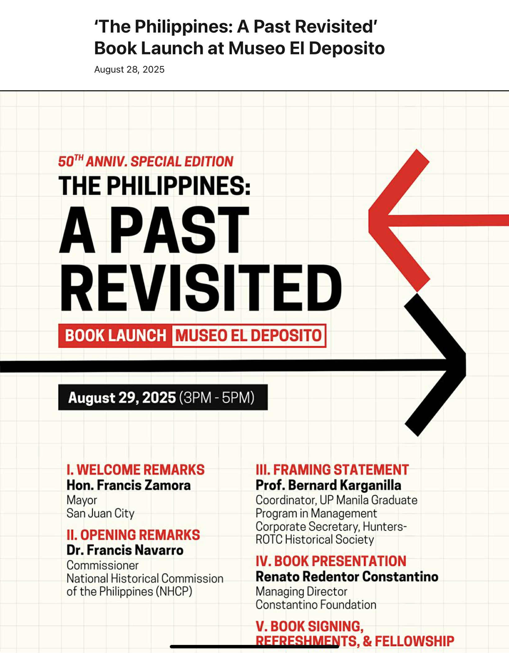 SAN JUAN CITY, METRO MANILA ─ The National Historical Commission of the Philippines (NHCP) together with the Constantino Foundation, Masters of Management Program of UP Manila, Hunters-ROTC Historical Society and the City Government of San Juan will launch the 50th anniversary special edition of The Philippines: A Past Revisited by Renato Constantino and Letizia Roxas Constantino.